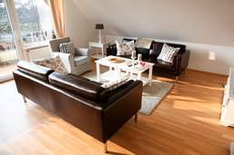 Zwei gemütliche Ledercouchen, zwei Sessel und ein 55 Zoll Fernseher im Wohnzimmer sorgen für eine angenehme Atmosphäre. An schönen Tagen lädt die große Dachterrasse mit Strandkorb zum Entspannen ein.